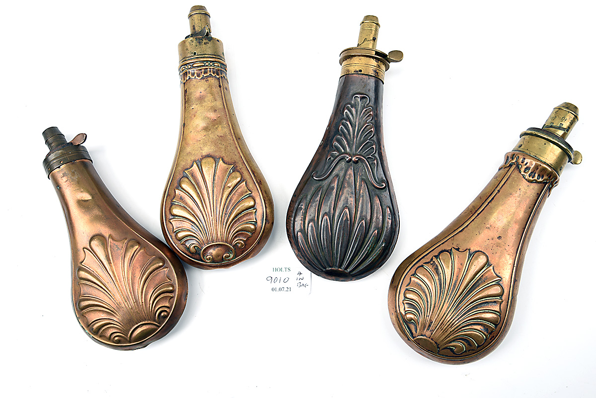 A COLLECTION OF FOUR MID 19TH CENTURY ENGLISH POWDER FLASKS,