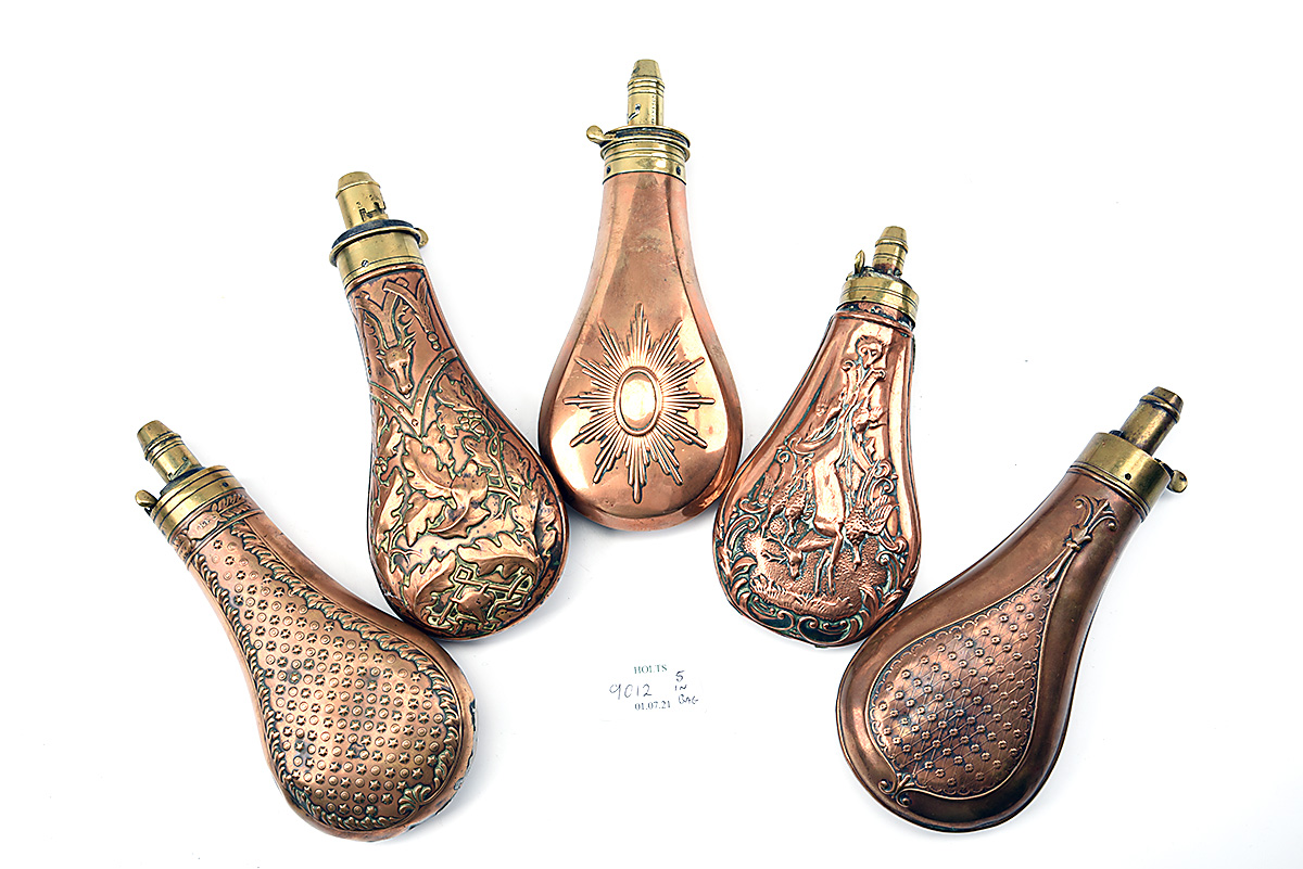 A COLLECTION OF FIVE MID 19TH CENTURY ENGLISH POWDER FLASKS,