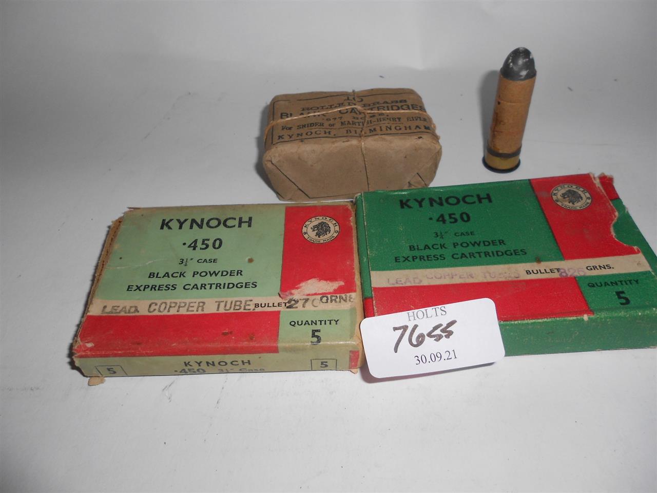 2 original Kynoch cartons of 5 rounds .450 3/4in. Black Powder Express 270 grn. lead / copper tube bullet, one sealed packet the other with rounds that have corrosion on them.