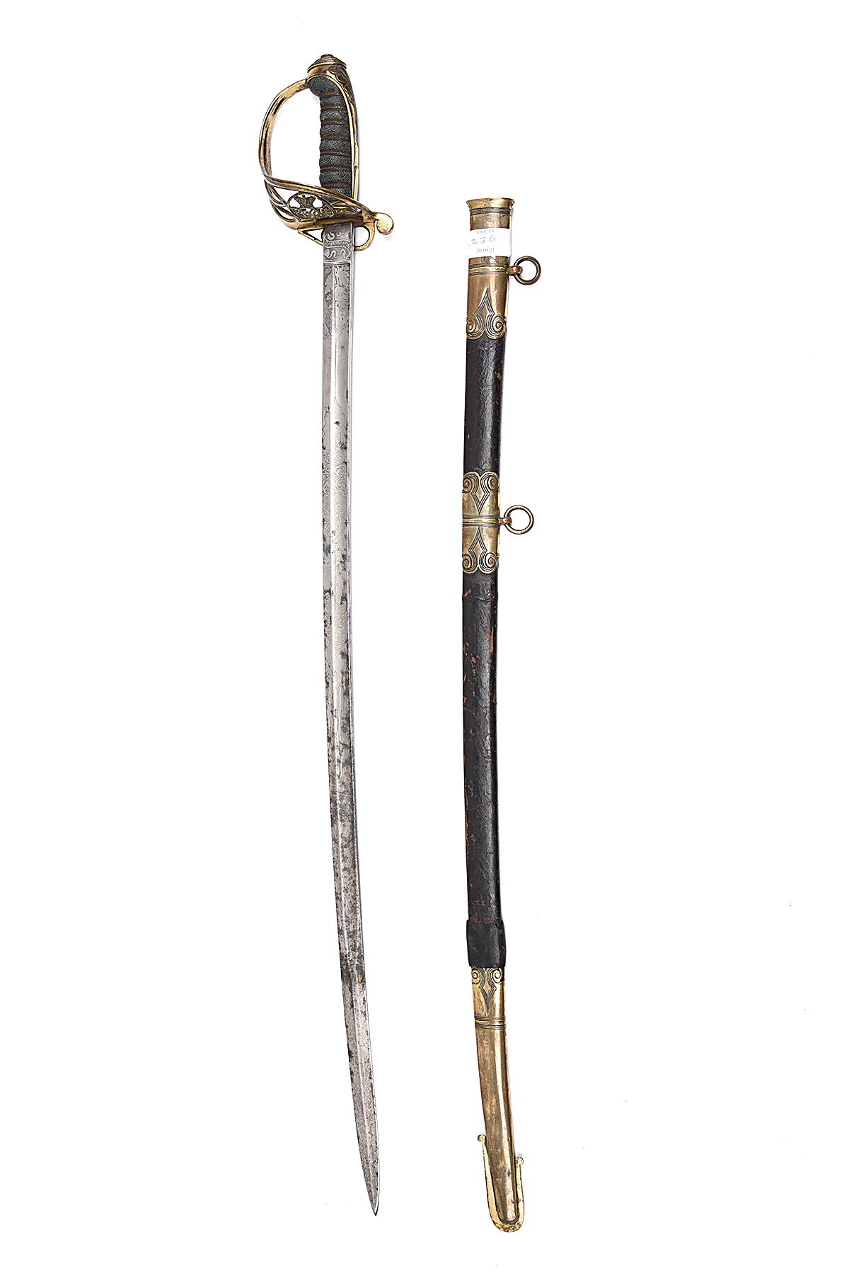 A PATTERN 1822 GENERAL OFFICER'S SWORD, mid-19th Century, with a slightly curved 31 1/2in. blade, fullered and etched on both sides with royal cyphers and scroll-work, 'WARRENTED' etched on one side and 'C. WEBB / 23 / OLD BOND St / LONDON' to other of ricasso, with folding brass gothic hilt with royal cypher and black fish-skin grip bound with copper wire, together with an associated black leather scabbard (no stud for the folding guard), with brass fittings and rings, blade stained, scabbard worn, chape dented and a glued leather patch to the leather above the chape