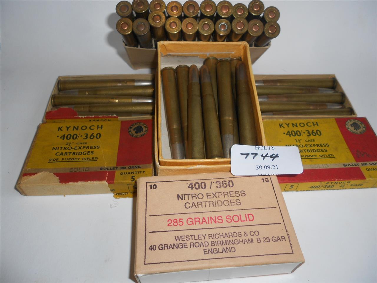 50 ROUNDS .400/.360 2 3/4in. 285 grn NE AMMUNITION FOR PURDEY RIFLES Please be advised that cartridges/ammunition, primers, primed cases, blanks and percussion caps cannot be sent to you by post or carrier. If you wish, you can book a collection at one of our regional valuation days, or collect from our offices at PE31 6HA in Norfolk