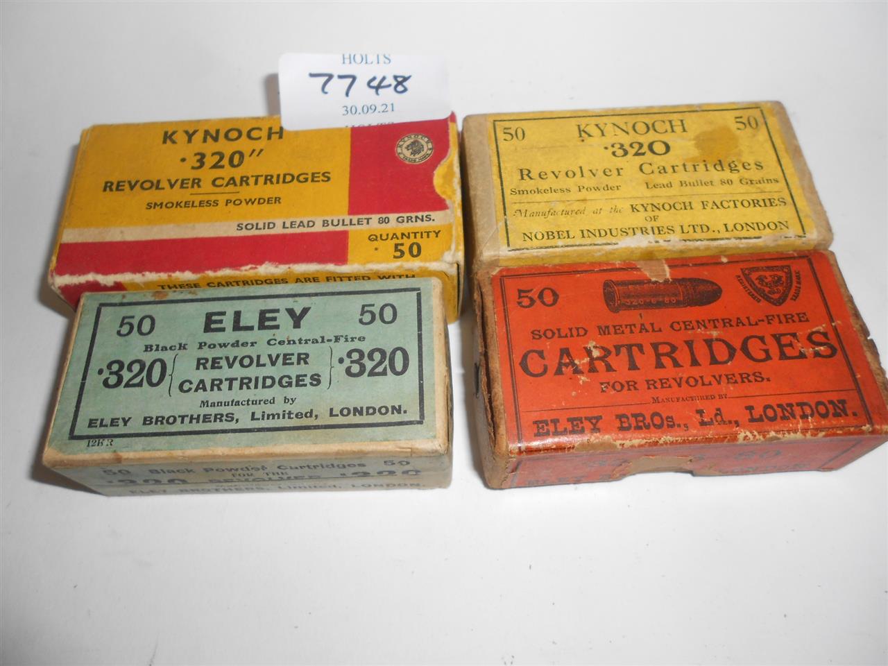 200 ROUNDS OF COLLECTABLE .320 REVOLVER AMMUNITION BY ELEY LONDON AND KYNOCH IN HIGHLY COLLECTABLE EARLY CARTONS Please be advised that cartridges/ammunition, primers, primed cases, blanks and percussion caps cannot be sent to you by post or carrier. If you wish, you can book a collection at one of our regional valuation days, or collect from our offices at PE31 6HA in Norfolk