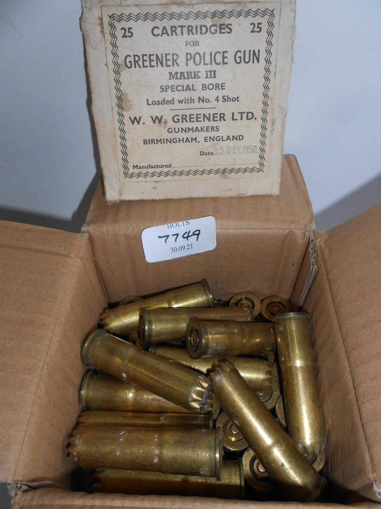 50 GREENER RIOT GUN BRASS CASED 12/14 BORE Mk111 CARTRIDGES DATED 1950, LOADED WITH No 4 SHOT Please be advised that cartridges/ammunition, primers, primed cases, blanks and percussion caps cannot be sent to you by post or carrier. If you wish, you can book a collection at one of our regional valuation days, or collect from our offices at PE31 6HA in Norfolk