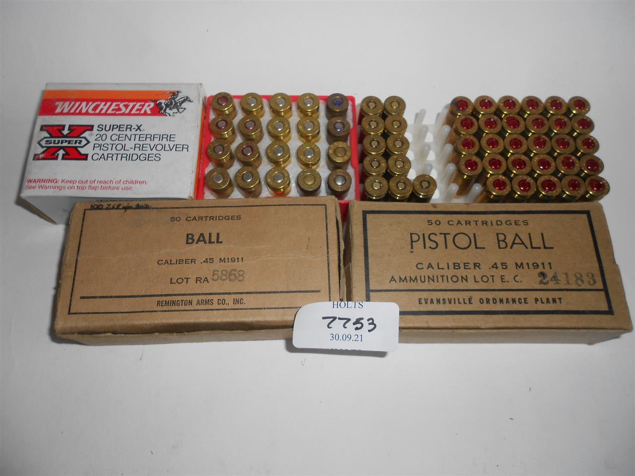 180 ROUNDS .45 AUTO PISTOL AMMUNITION OF VARIOUS TYPES AND BRANDS, ONE CARTON EVANSFIED ORDNANCE Please be advised that cartridges/ammunition, primers, primed cases, blanks and percussion caps cannot be sent to you by post or carrier. If you wish, you can book a collection at one of our regional valuation days, or collect from our offices at PE31 6HA in Norfolk