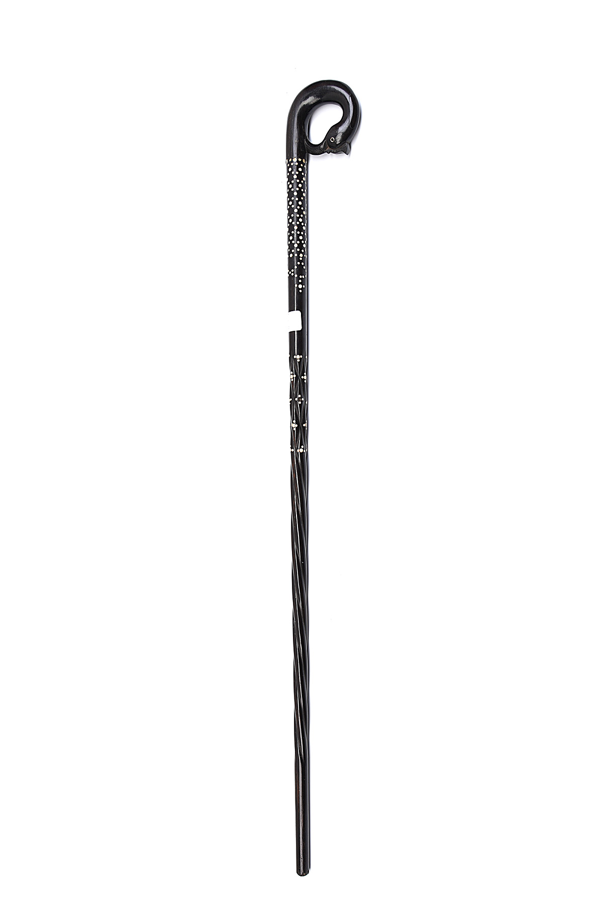AN EDWARDIAN EBONY & BONE MOUNTED WALKING-STICK, circa 1910, with approximately 32in. shaft of twist form blending into an area decorated with flush-fitting bone pegs, the handle of zoomorphic form depicting the head of a waterfowl, 34in. overall