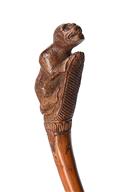 A CARVED VICTORIAN WALKING-STICK WITH POMMEL IN THE FORM OF A MONKEY, circa 1895, 35 3/4in. overall with plain tapering shaft, the pommel realistically carved in the form of a monkey waiting to pounce