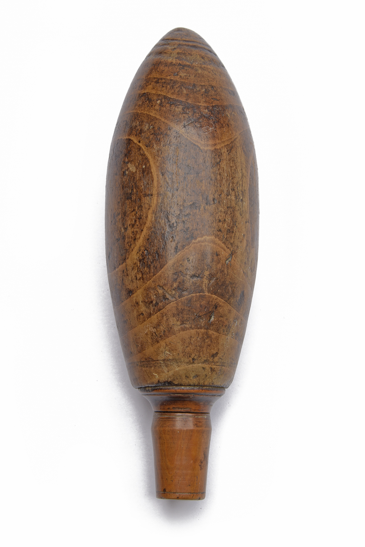 AN UNUSUAL TREEN POWDER-FLASK probably late 18th century and continental, turned from probable pine wood in a 'bomb' shape with rose wood cap and yew wood cup measure to top, approximately 7in. overall