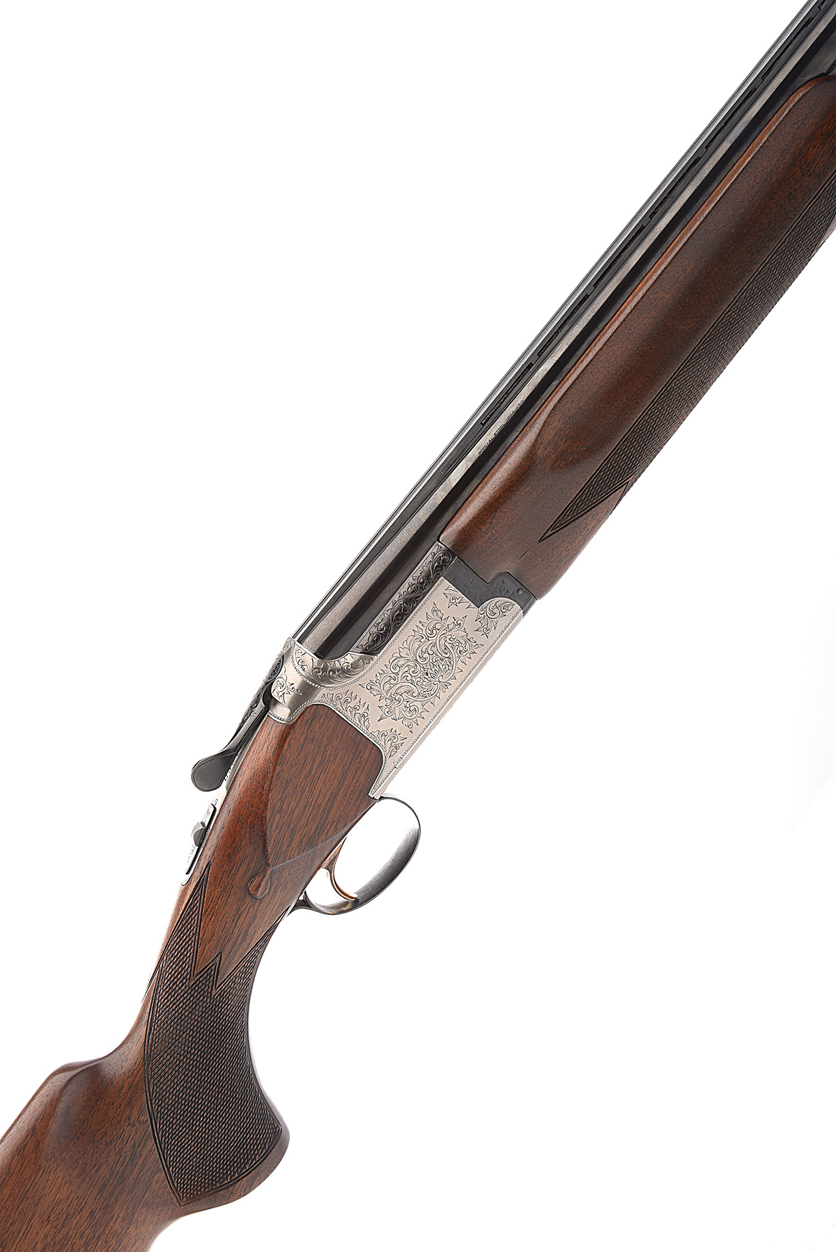 MIROKU FIREARMS MFG. CO. SINGLE-TRIGGER OVER AND UNDER EJECTOR, serial no. 80349PM, circa 1977, 32in. nitro barrels (slightly loose), with 10mm ventilated matt rib, 2 3/4in. chambers, 3/4 and full choke, hold-open toplever, manual safety with integral barrel-selector switch, gold-washed trigger, border and acanthus engraving, silver and blued finish, 14 1/4in. pistolgrip stock including rubber recoil pad, weight 8lb. 1oz., in a Parsons 'Essex gun' fleece-lined canvas slip