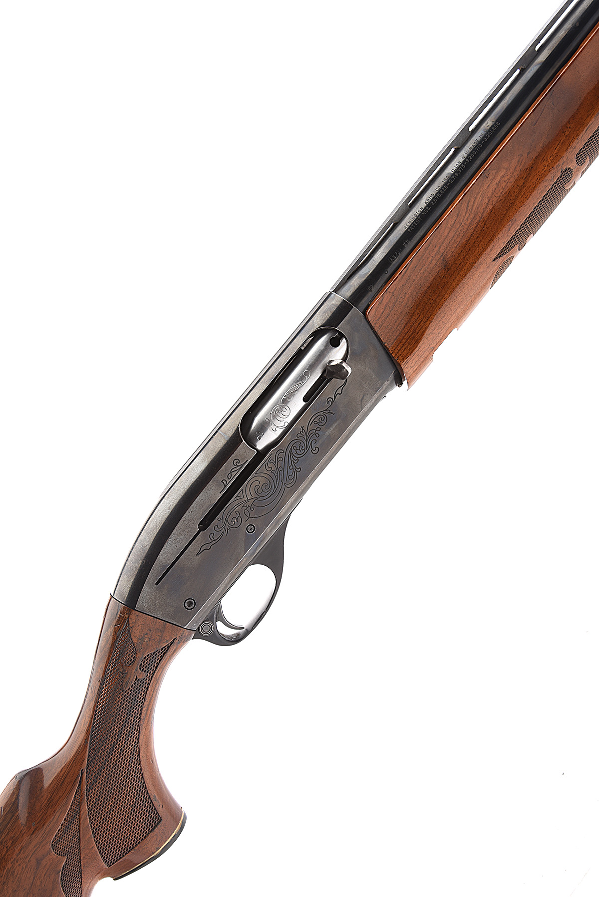 FOR SPARES AN F.A.C. REMINGTON 12-BORE '1100' SEMI-AUTO SHOTGUN, serial no. 122510V, circa 1972, 25 1/2in. nitro barrel with 7mm ventilated matt rib, 2 3/4in. chamber, bored approx. true cyl. choke, manual push-button safety, acanthus scroll engraving the bolt carved en-suite, blacked finish, 14in. ornately chequered pistolgrip stock including buttplate