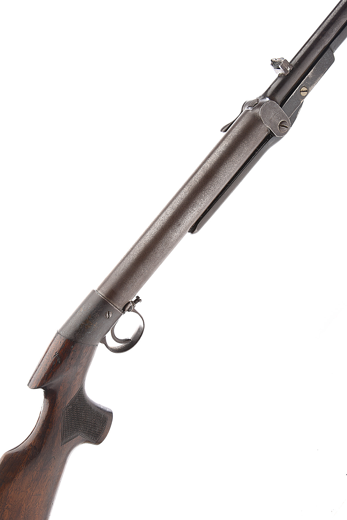 A .177 UNDER-LEVER AIR-RIFLE SIGNED BSA, MODEL 'THE BSA AIR-RIFLE', serial no. 9547, for 1906-07, with 19 1/4in. barrel (missing fore-sight), tap-action breech, plain air-chamber marked with make and model details, saw-handled walnut butt and 'Spade' catch under-lever, minimal traces of finish