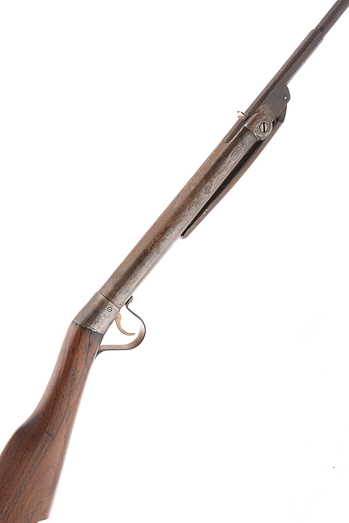 A .177 BREAK-BARREL AIR-RIFLE, UNSIGNED, MODEL 'PUSH-BUTTON MILLITA', serial no. 23686, circa 1925 and probably by Langenhan, Germany, with octagonal to round 17 3/4in. sighted barrel, plain air-chamber with barrel release button, straight hand walnut butt-stock, replacement trigger guard bow and no provision for fore-end, rusted externally