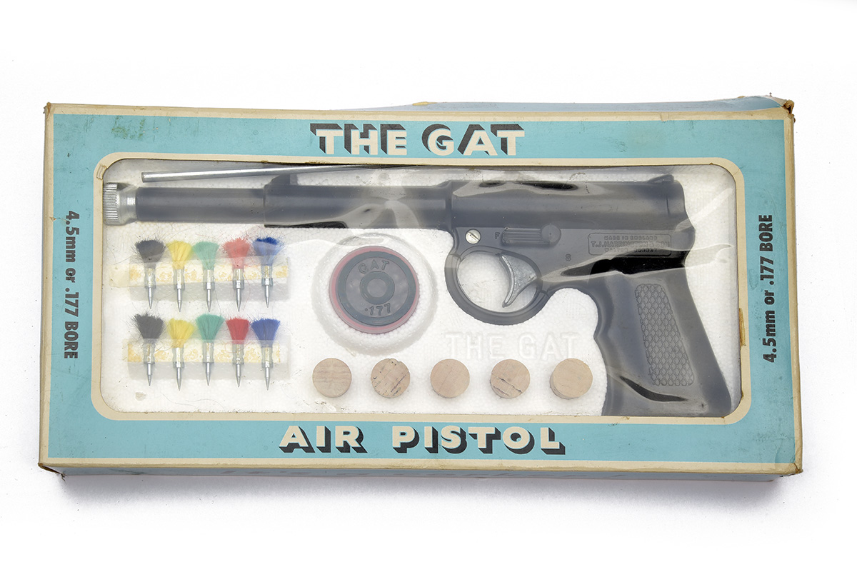 A .177 PUSH-BARREL AIR-PISTOL SIGNED T J HARRINGTON, MODEL 'THE GAT' no visible serial number, with a 6in. barrel, open sights, black painted, boxed with all accessories.