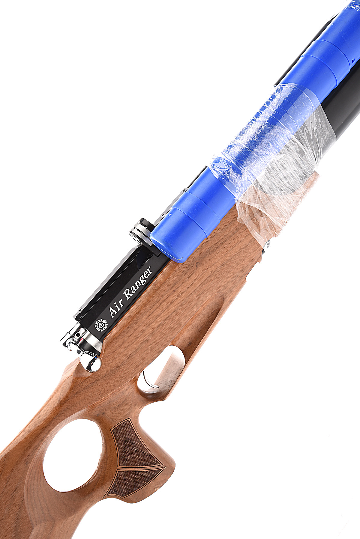 A .22 PNEUMATIC AIR- RIFLE SIGNED DAYSTATE, MODEL 'AIR RANGER' serial no. SB 041, with a 21 1/2in. fully suppressed barrel, dovetail grooved action for a telescopic sight, comes with filling hose and a magazine in an ambidextrous walnut thumbhole stock