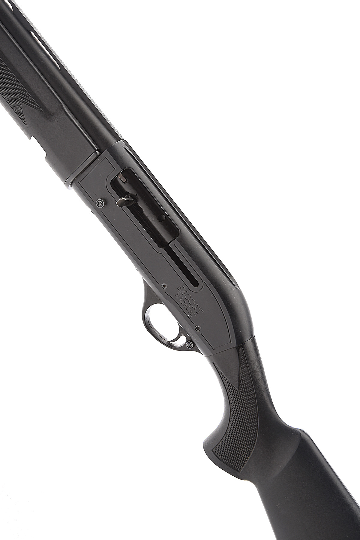 A LEFT-HANDED HATSAN 12-BORE (3IN.) 'ESCORT MAGNUM' SEMI-AUTO SHOTGUN, serial no. 113804, circa 2007, restricted magazine, 30in. steel-shot proofed nitro barrel with 6mm ventilated matt rib, 3in. chamber, multichoke (no spares), manual push-button safety, magazine cut-off switch, 15 1/4in. synthetic pistolgrip stock including ventilated rubber recoil pad, the whole in matt black finish