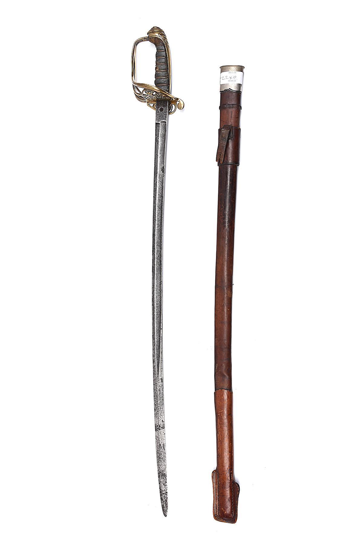 A PATTERN 1845 INFANTRY OFFICER'S SWORD, circa mid 19th Century, with 32in. fullered and with etching on both sides with scroll-work and royal cyphers, proved star and recess for plug on ricasso (plug absent), Gothic folding brass guard, black fish-skin grip bound with copper wire, together with an unassociated brown leather field scabbard with steel locket, all heavily worn, blade stained and pitted, etching faint, guard badly miss-shapen, pommel with losses to the brass, losses to the grip, locket loose
