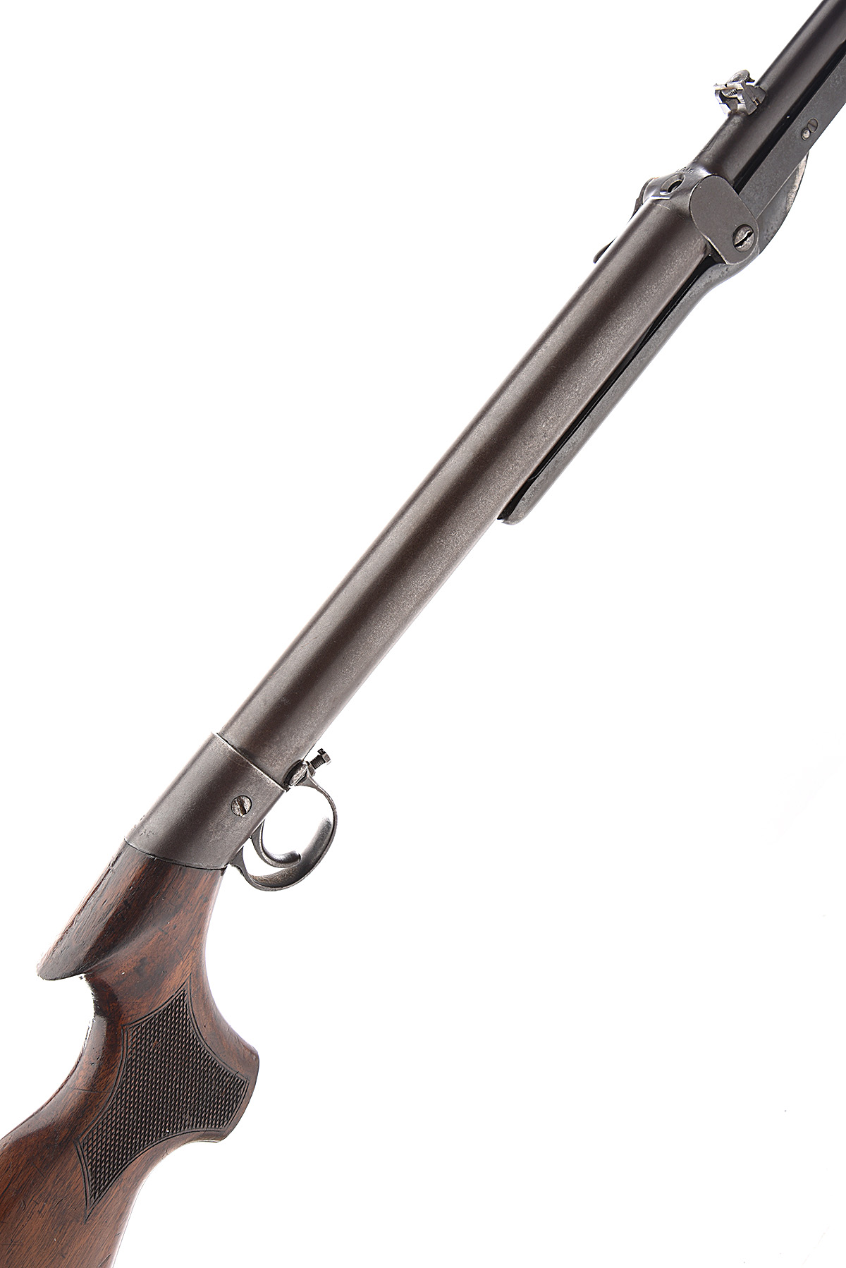 A .22 UNDER-LEVER AIR-RIFLE SIGNED BSA, MODEL 'THE BSA AIR-RIFLE IMPROVED MODEL 'D'', serial no. S729782, for 1913, with 19 1/4in. sighted barrel, plain air-chamber (no etching visible), walnut saw-handled butt-stock and side-catch under-lever, traces of finish