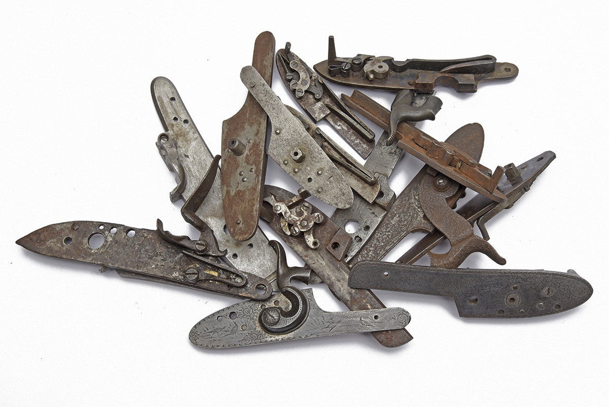 A QUANTITY OF HAMMERGUN LOCKPLATES, 14 in total, some with hammers and parts, percussion, flint and central fire, mostly original but some reproduction