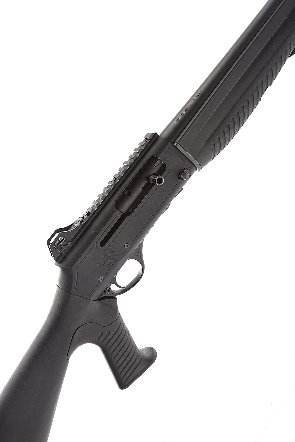 AN F.A.C. HATSAN 12-BORE (3IN.) 'ESCORT MAGNUM' SEMI-AUTO SHOTGUN, serial no. 231459, circa 2017, extended tubular magazine, 25 1/4in. steel-shot proofed nitro barrel including muzzle-break, 3in., chamber, manual safety, magazine cut-off switch, elongated charger-handle, fore-end with in-built picatinny rail fitted with a laser sight (untested), 14 1/4in. synthetic pistolgrip stock including rubber recoil pad, with provision for two cartridges, the whole in matt black finish