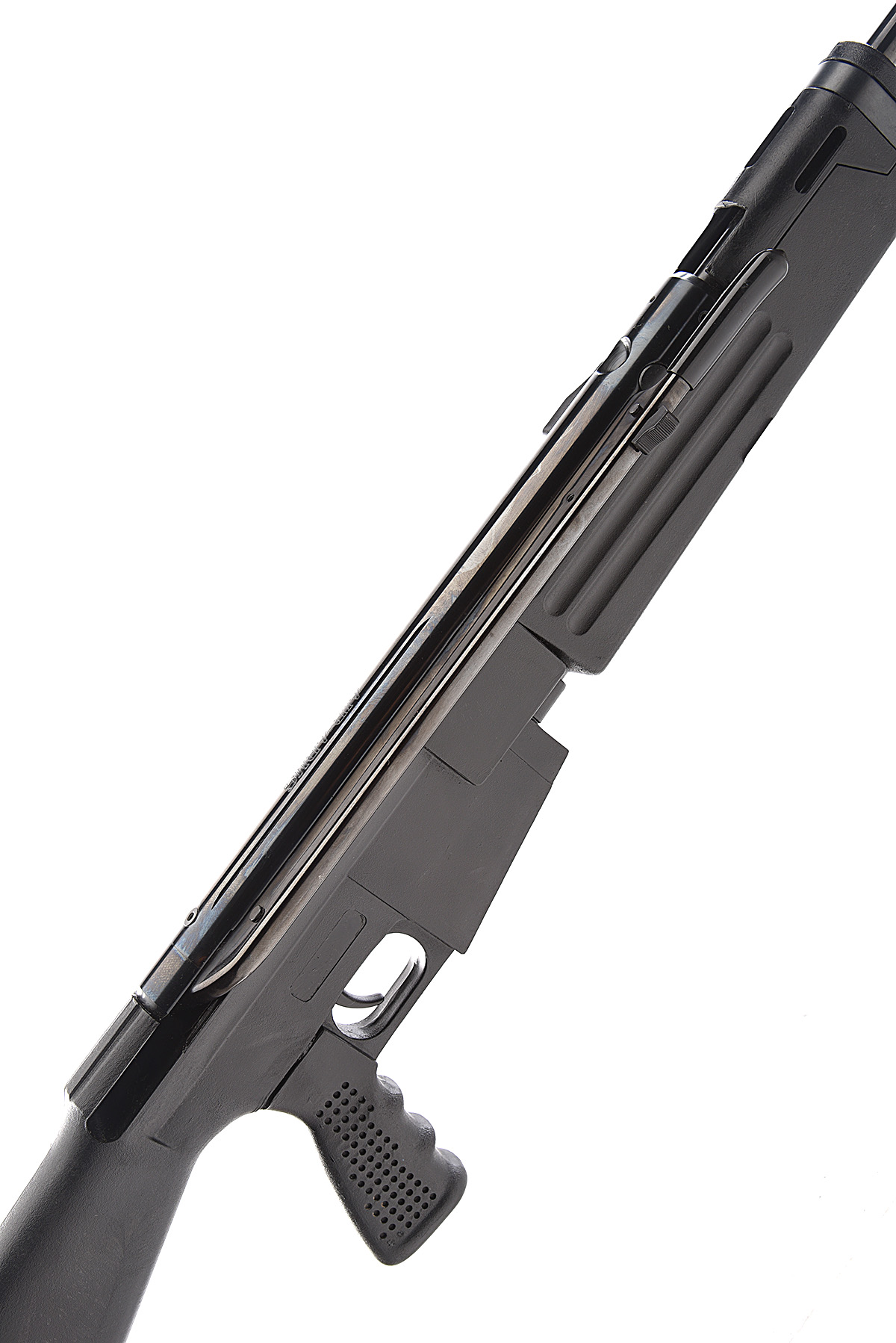 A .22 SIDE-COCKING AIR RIFLE SIGNED AIR ARMS, MODEL 'HI-POWER' serial no. 39842, with a 17 3/4in. barrel, nicely blued metalwork, top loading breech tap in a black plastic stock with pistol grip in collectors condition.
