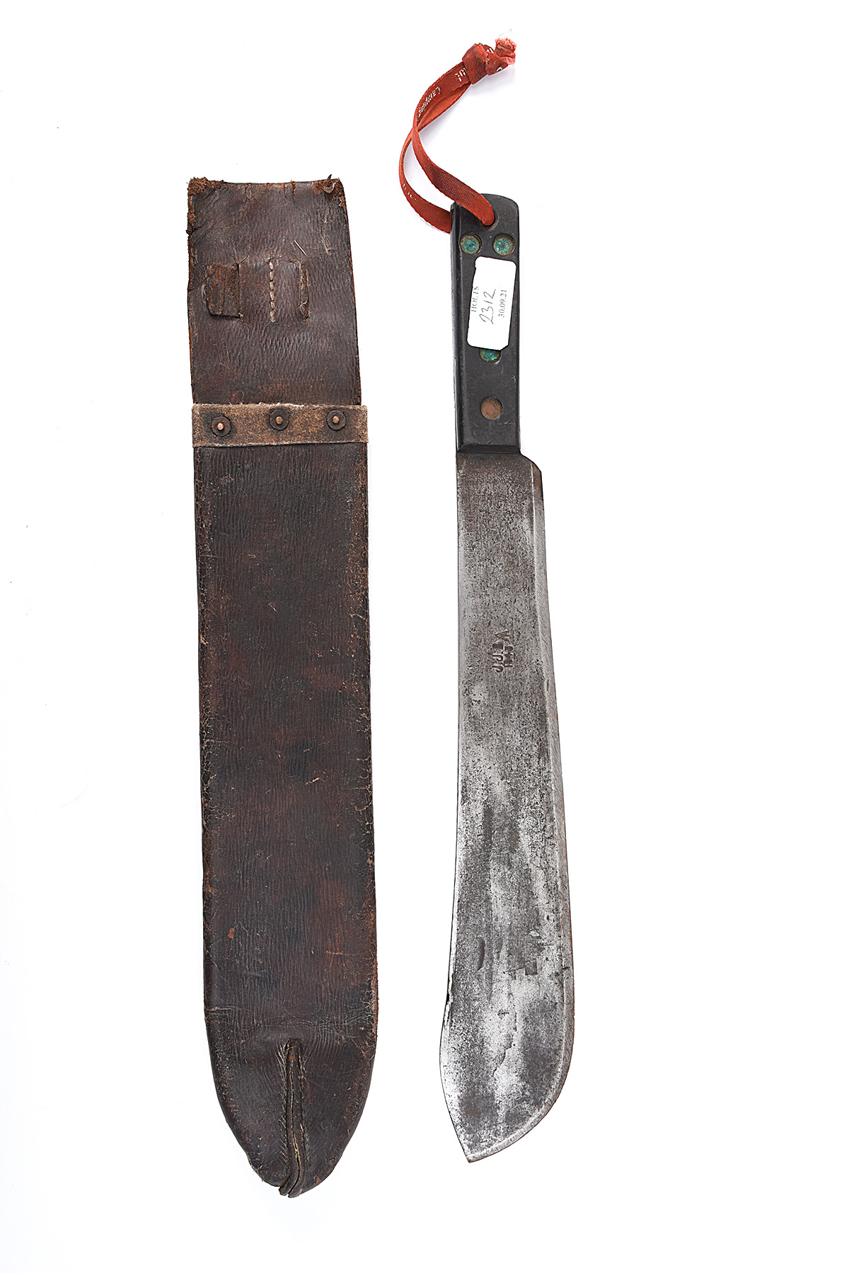 A MILITARY MACHETE SIGNED 'J.J.B.' AND DATED 1943, with 14 1/2in. bolo blade, slab hilt held with five copper rivets and in its leather scabbard marked 'H. CARSON Co. LTD, OTTAWA 1944'