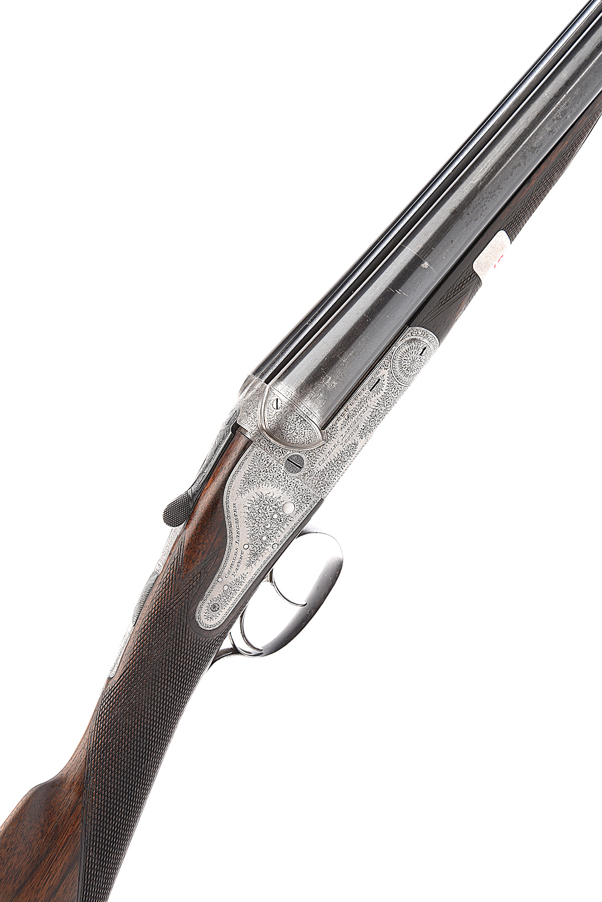 CHARLES LANCASTER 12-BORE ASSISTED-OPENING BACK-ACTION SIDELOCK EJECTOR, serial no. 6819, circa 1892, 28in. sleeved nitro barrels, 2 3/4in. chambers, bored approx. 1/2 and 3/4 choke, Lancaster patent assisted-opening action, carved fences, striker discs, slim toplever, automatic safety, dipped-edge lockplates, fine border and acanthus scroll engraving, brushed finish, 15 5/8in. replacement stock, weight 6lb. 11oz., in its makers canvas and leather case