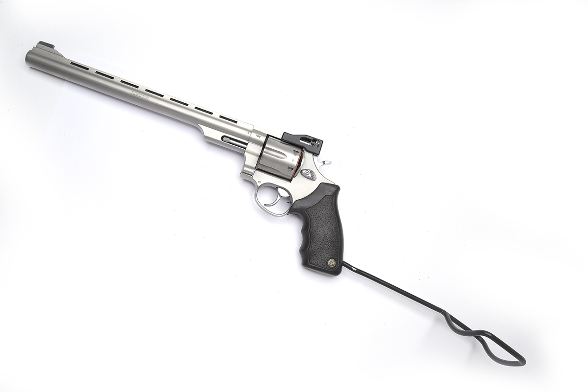 A .44 (MAG) LONG BARRELLED REVOLVER SIGNED TAURUS, serial no. BU660398, with a 12in. barrel, stainless barrel, frame and cylinder with open sights and rubber hand grips, fitted with brace for the UK market