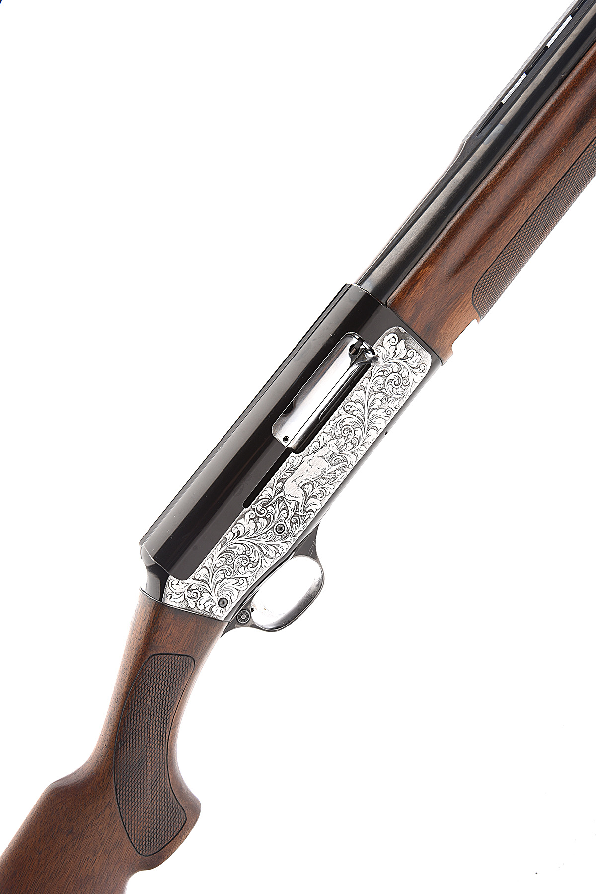 AN F.A.C. S.P.A. LUIGI FRANCHI 12-BORE '48/AL HUNTER' SEMI-AUTO SHOTGUN, serial no. D36436, dated 1973, 28in. nitro barrel with 7mm raised ventilated matt rib, 2 3/4in. chamber, bored approx. 1/2 choke, manual push-button safety, blacked action with silver side panels engraved with acanthus scroll and hounds on point, 14in. pistolgrip stock including trademark buttplate