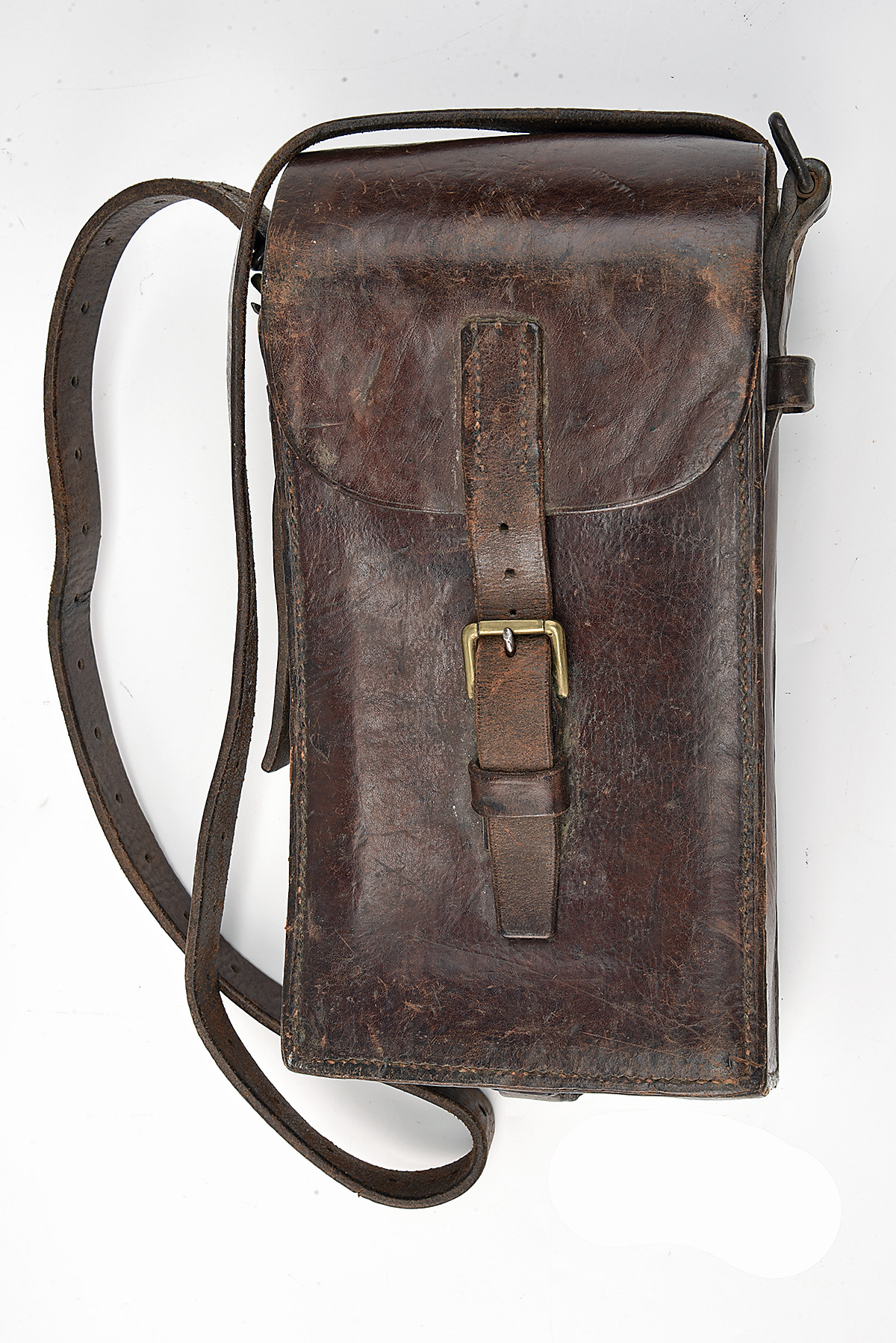 A RARE DANISH ARMY MAGAZINE POUCH FOR THE MODEL 1950 MADSEN LIGHT MACHINE GUN, circa 1950s, hard brown leather case with brass fittings and carrying strap, no splits or tears, 13 in. x 6 in. x 4 1/2 in. approx.