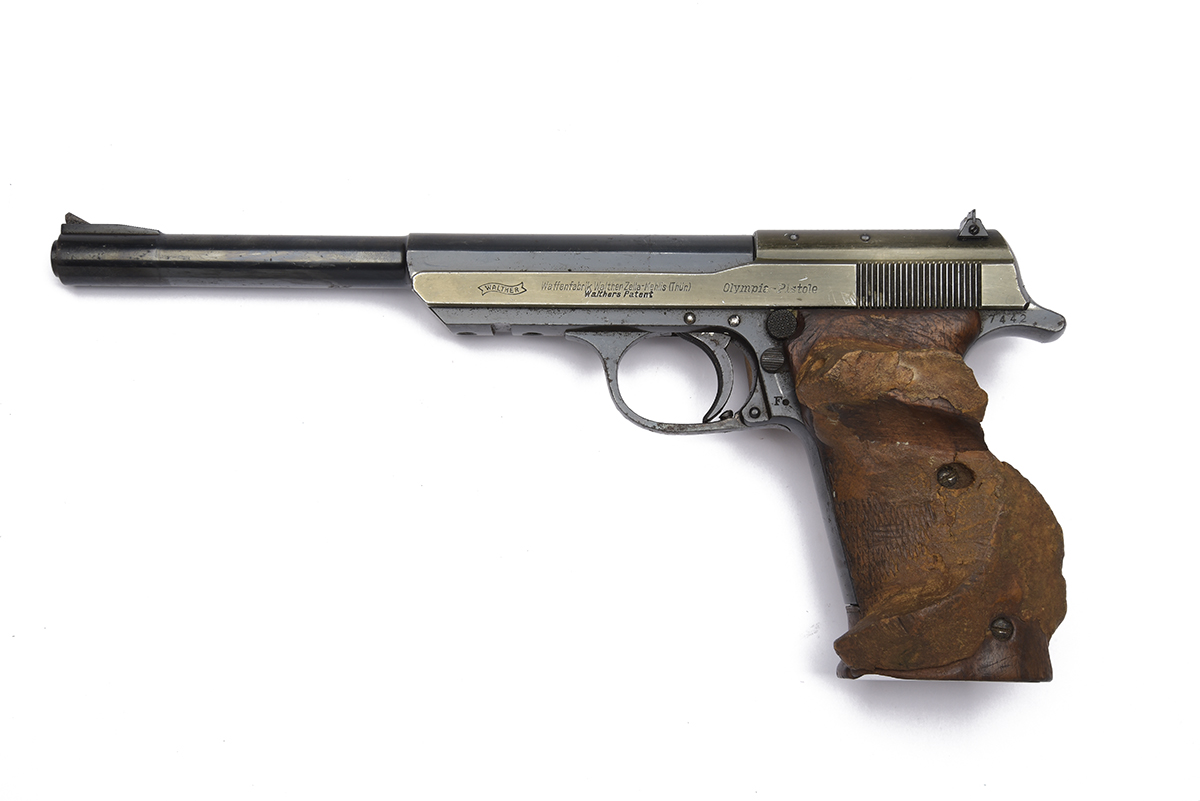 A .22 (SHORT) SEMI-AUTOMATIC PISTOL SIGNED WALTHER, MODEL 'TARGET OLYMPIA' serial no. 7442, with a 7 1/2in. barrel, open sights and custom hand grip.