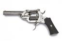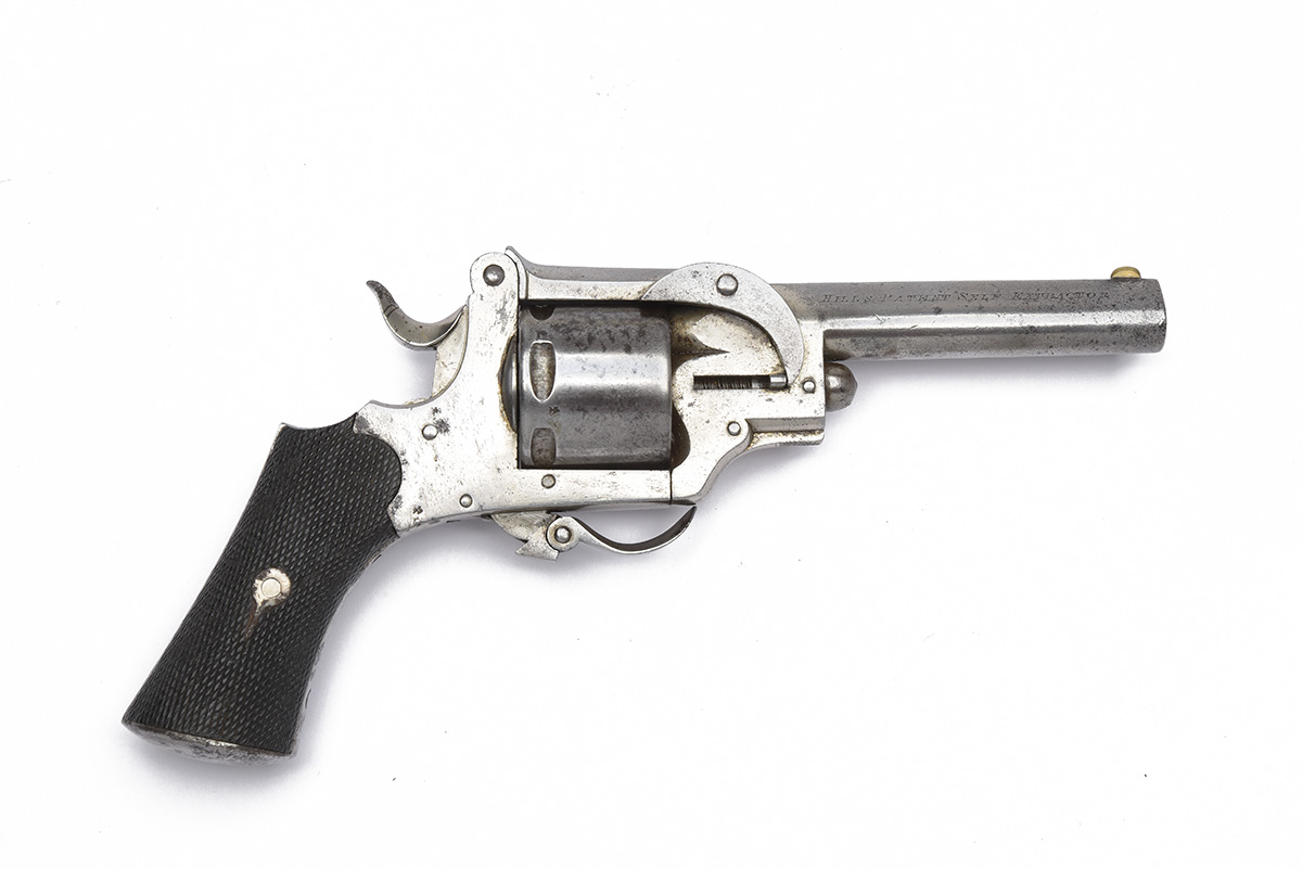 A .320 (SHORT REV) SIX-SHOT POCKET-REVOLVER, MODEL 'HILL'S PATENT SELF-EXTRACTOR', no visible serial number, with ovoid 3 3/4in. barrel, the right hand side inscribed 'HILL'S PATENT SELF EXTRACTOR', faceted top-strap with crescentic 'claw' operating on the cylinder extraction star, break up and over frame released via a catch at the bottom front edge of trigger-guard, plain cylinder, flared chequered walnut grips and folding double-action trigger, the whole retaining traces of original nickel-plated finish