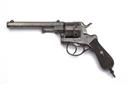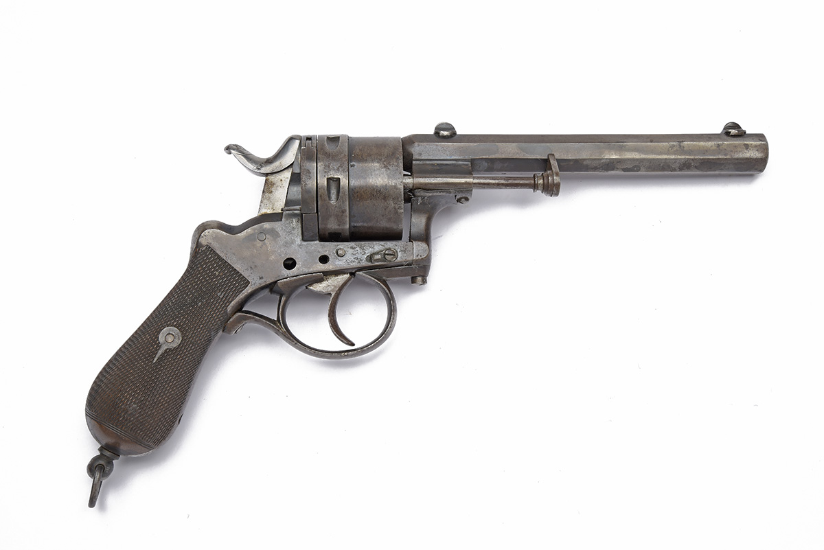 A .450 SIX-SHOT REVOLVER, UNSIGNED, MODEL 'PINFIRE TYPE', no visible serial number, almost certainly Belgian but Birmingham proved, with sighted octagonal 6in. barrel, open pinfire style frame, stepped plain cylinder and chequered bag-shaped grips
