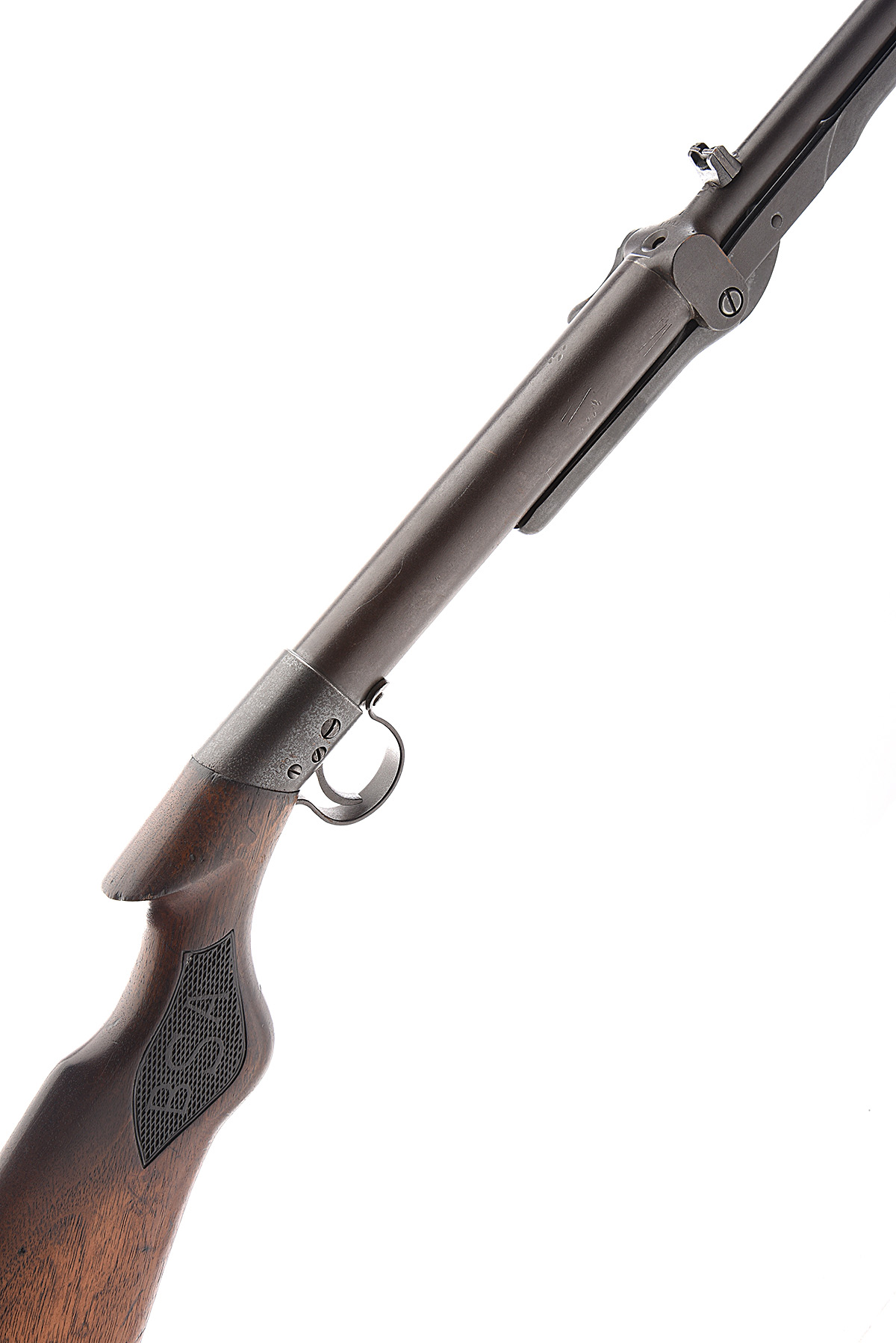 A. 177 UNDER-LEVER AIR-RIFLE SIGNED BSA, MODEL 'LADIES or LIGHT PATTERN STANDARD', serial no. L33010, for 1928, with 17in. barrel, plain air-chamber (no etching visible), saw-handled walnut butt-stock and push-button release under-lever, slight traces of finish remaining