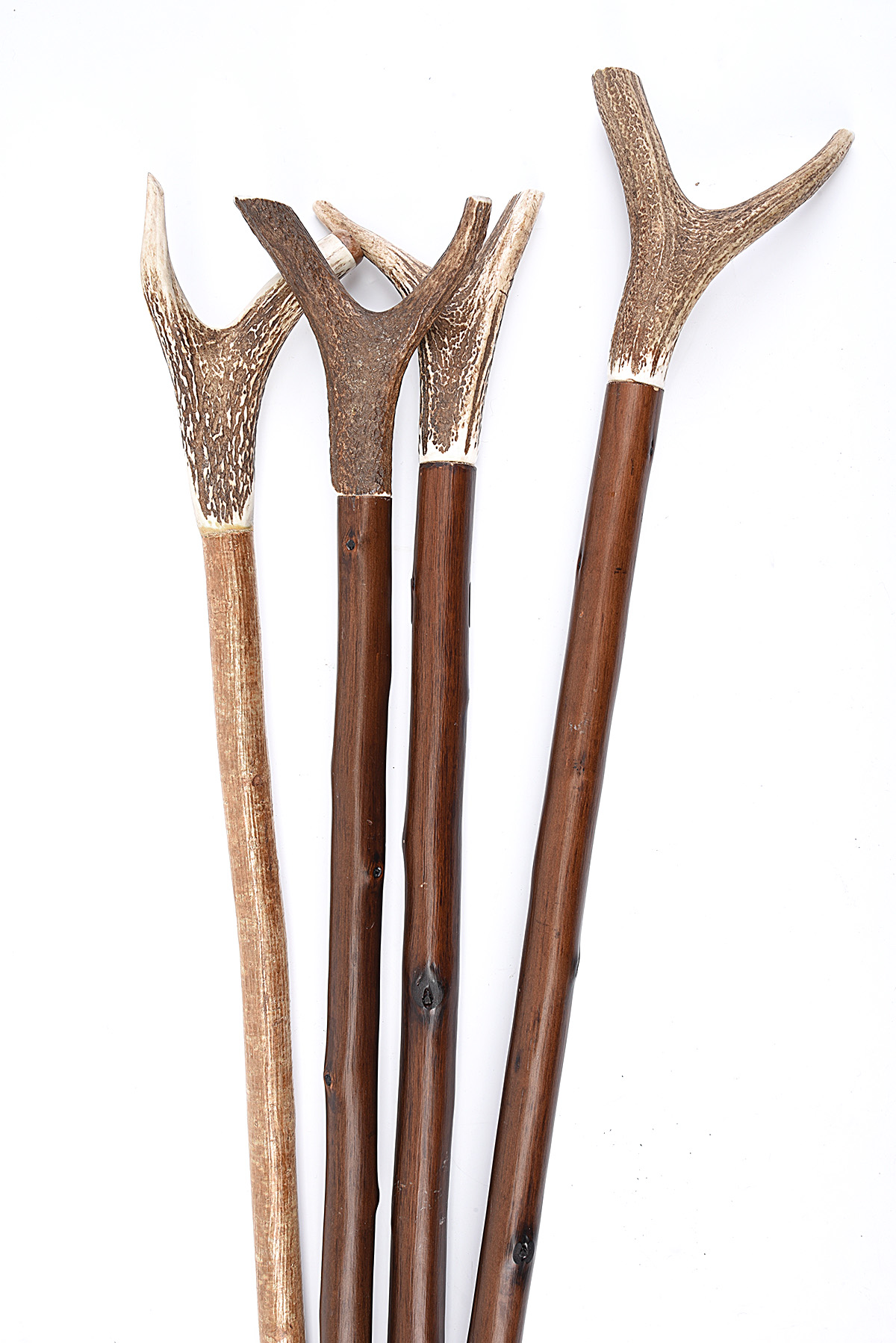 A COLLECTION OF FOUR ANTLER TOP WALKING STAFFS,