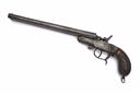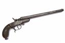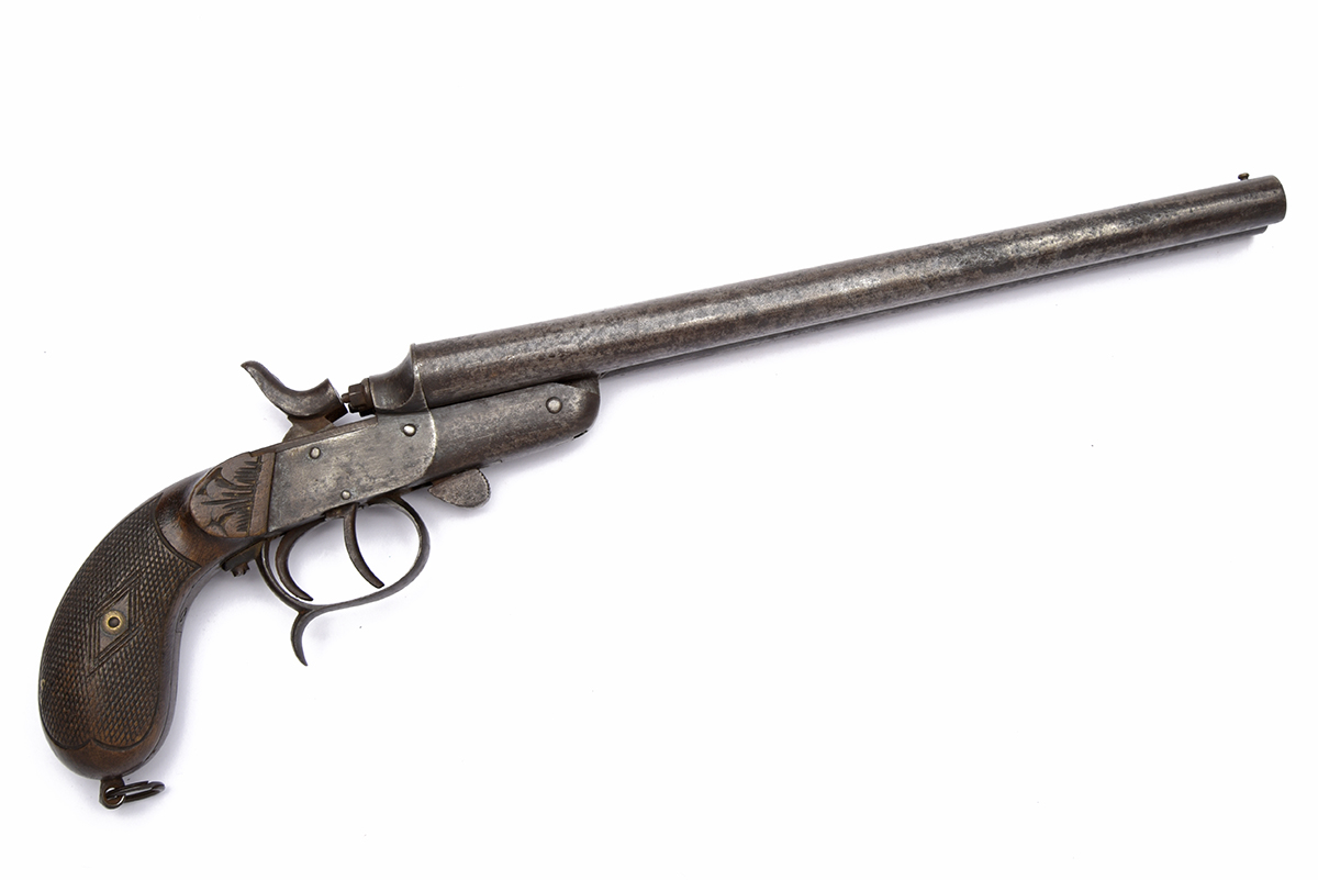 A .410 (2IN.) DOUBLE BARRELLED HAMMER SHOT-PISTOL, UNSIGNED, serial no. 22, circa World War One, with 9 1/2in. barrels (some pitting), boxlock action with twin hammers and twin triggers and chequered walnut bag-shaped butt, finish worn