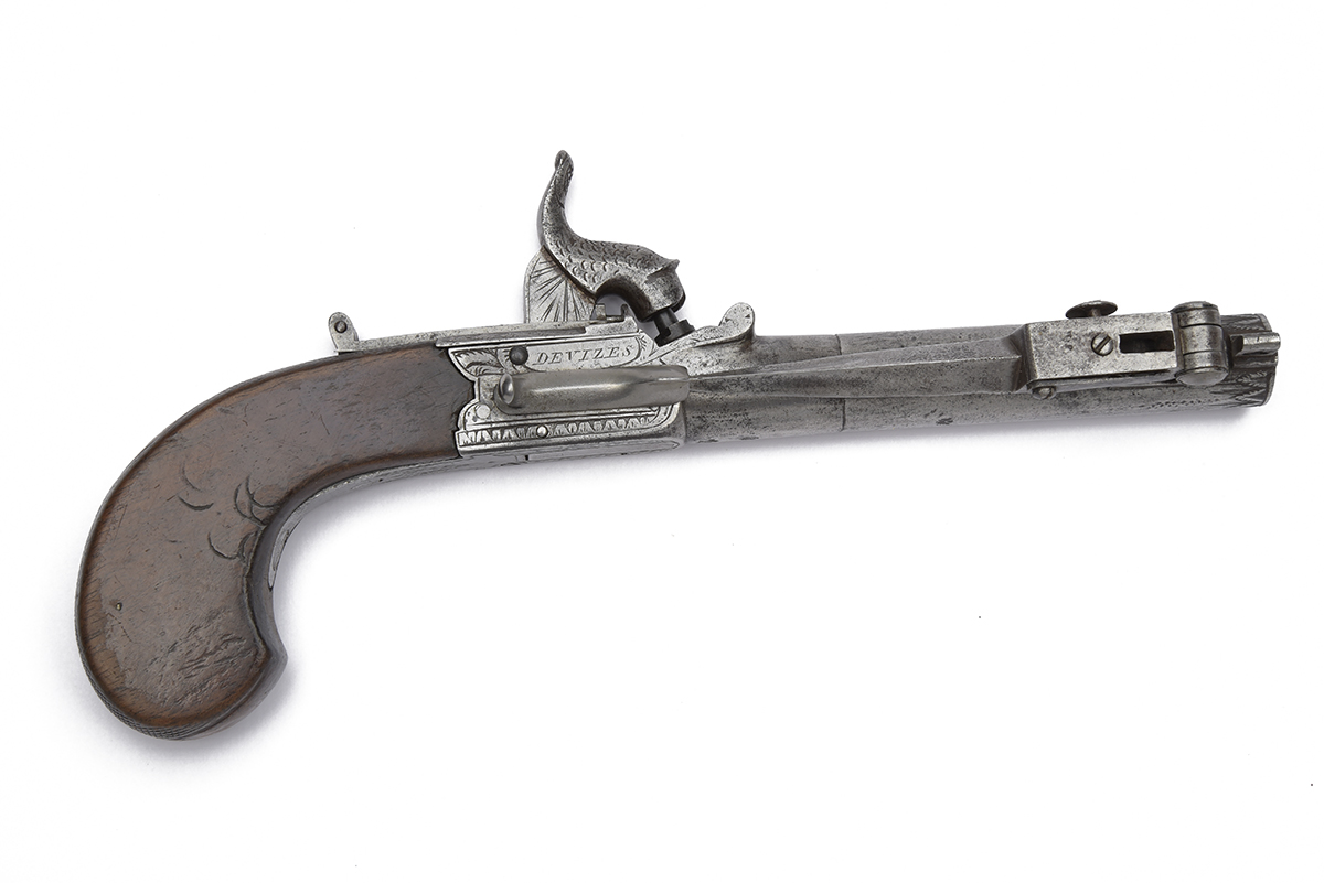 A 54-BORE PERCUSSION POCKET-PISTOL SIGNED COLE, DEVISES WITH SPRUNG BAYONET, no visible serial number,