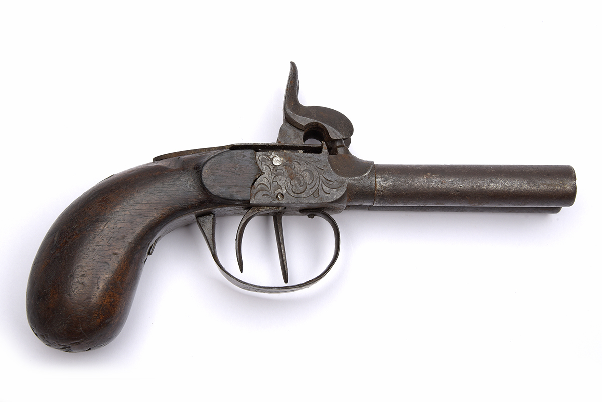 A 54-BORE PERCUSSION DOUBLE-BARRELLED POCKET-PISTOL, UNSIGNED, no visible serial number,