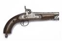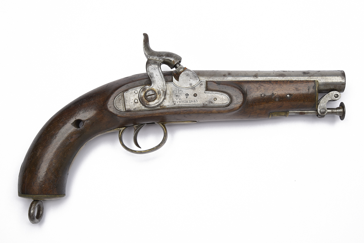 A .550 PERCUSSION PISTOL SIGNED TOWER, MODEL 'COASTGUARD' or 'CONSTABULARY', serial no. 50, dated for 1845, with 6in, brushed bright round barrel, borderline engraved lock of flint form, walnut full-stock bored through the grip for lanyard and stamped '50', brass furniture and captive iron ramrod