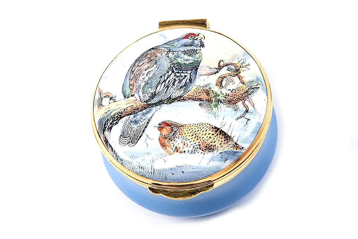 A CRUMMLESS & CO. ENAMEL & GOLD PILLBOX WITH JAMES PURDEY PILL BOX, the top decorated with a shooting scene, the lid interior with 'JAMES PURDEY'