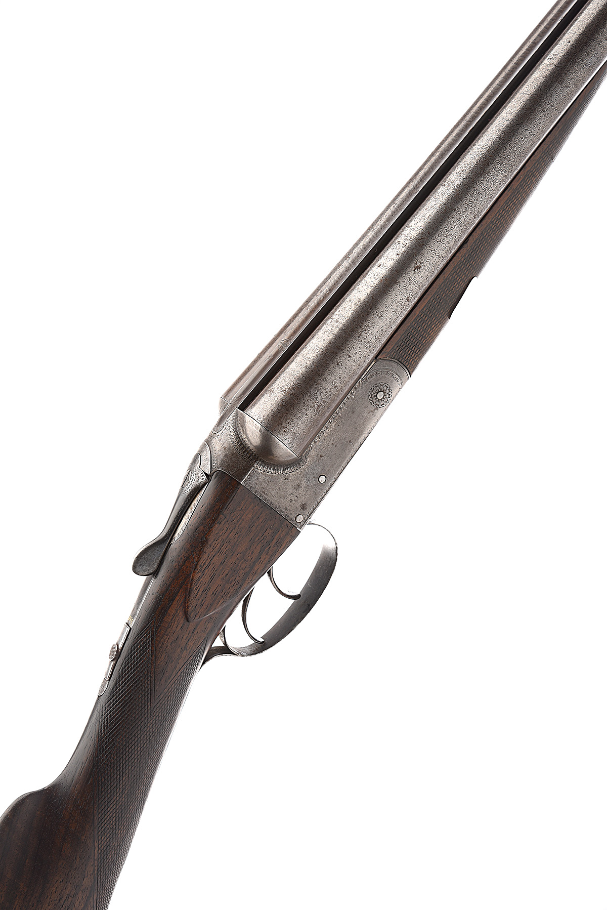 THOMAS TURNER 12-BORE BOXLOCK EJECTOR, serial no. 5903, circa 1893, 28in. nitro reproved damascus barrels, rib engraved 'THOMAS TURNER. 172. NEW BOND STREET. LONDON.', 2 1/2in. chambers, bored approx. 1/4 and 1/2 choke, treble-grip action, automatic safety with gold-inlaid 'SAFE' detail, border engraving, 14 1/2in. stock including buttplate, weight 6lb. 13oz.