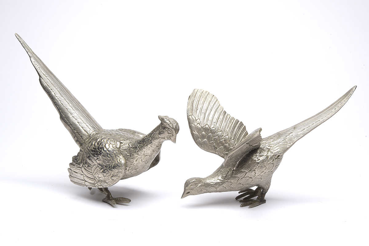 A PAIR OF SILVER PLATED PHEASANTS, each measuring approx. 9in. x 6in. 5in.