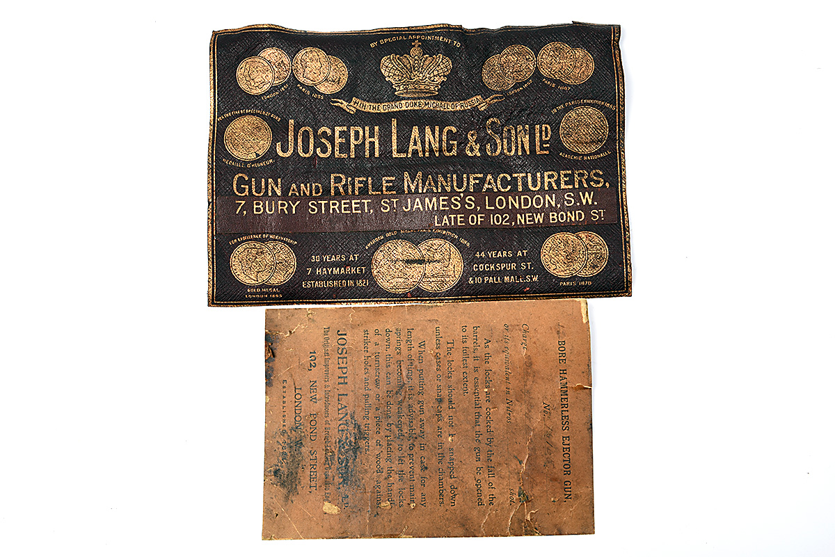 A JOSEPH LANG & SON LEATHER GOLD-TOOLED GUNCASE TRADE LABEL