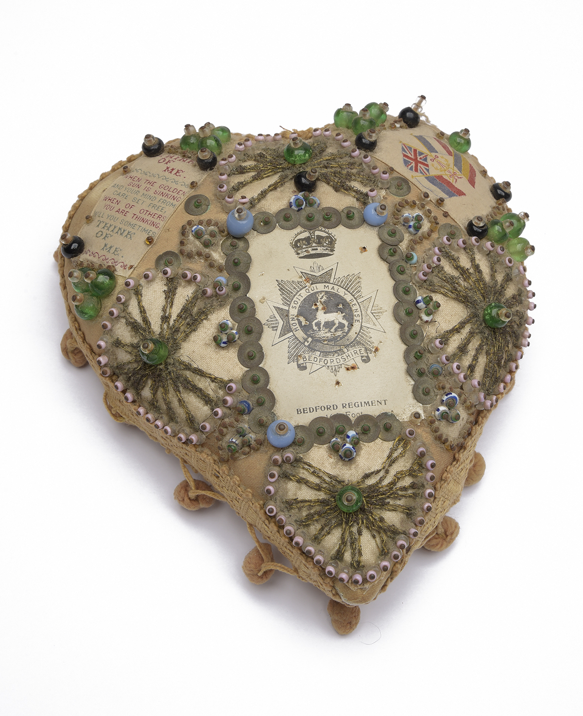 A SWEETHEART CUSHION TO THE BEDFORDSHIRE REGIMENT (16TH FOOT), almost certainly First World War, of heart-shaped design approximately 7in. x 6 1/2in. with central regimental Kings Crown device, the lobes decorated with a poem and flags of the allied nations, the remaining area decorated with glass green and pink beads in various patterns