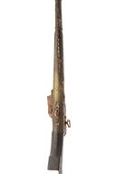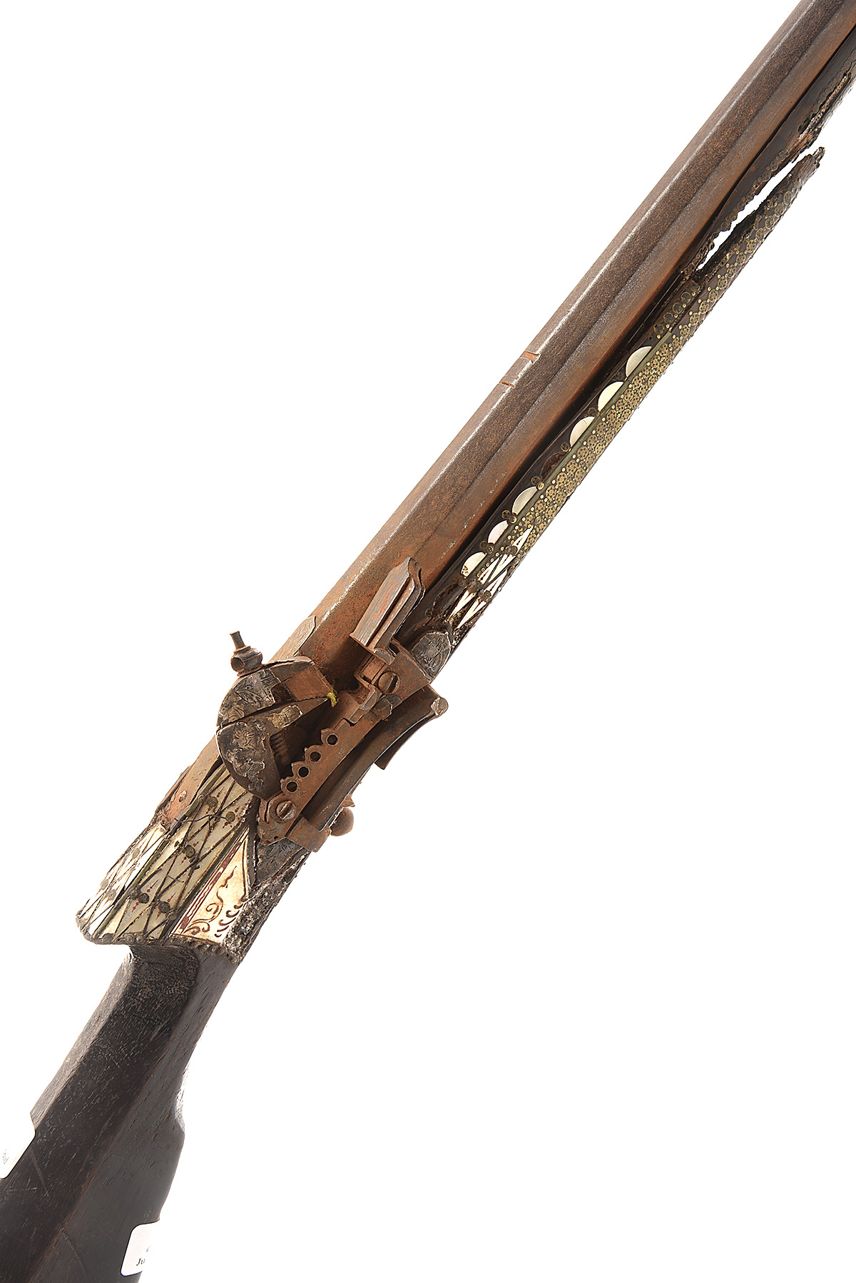 A .65 NORTH AFRICAN MIQUELET MUSKET, no visible serial number, circa 1840, with 49in. octagonal barrel with silver vee form front-sight and fixed vee rear-sight in silver, North African style miquelet lock, full wooden stock profusely decorated with inlaid mother of pearl, koftgari with some silver sheet the barrel secured by five decorated metal bands, the barrel rusted overall, the stock broken along forend, damage to and loss of decoration.