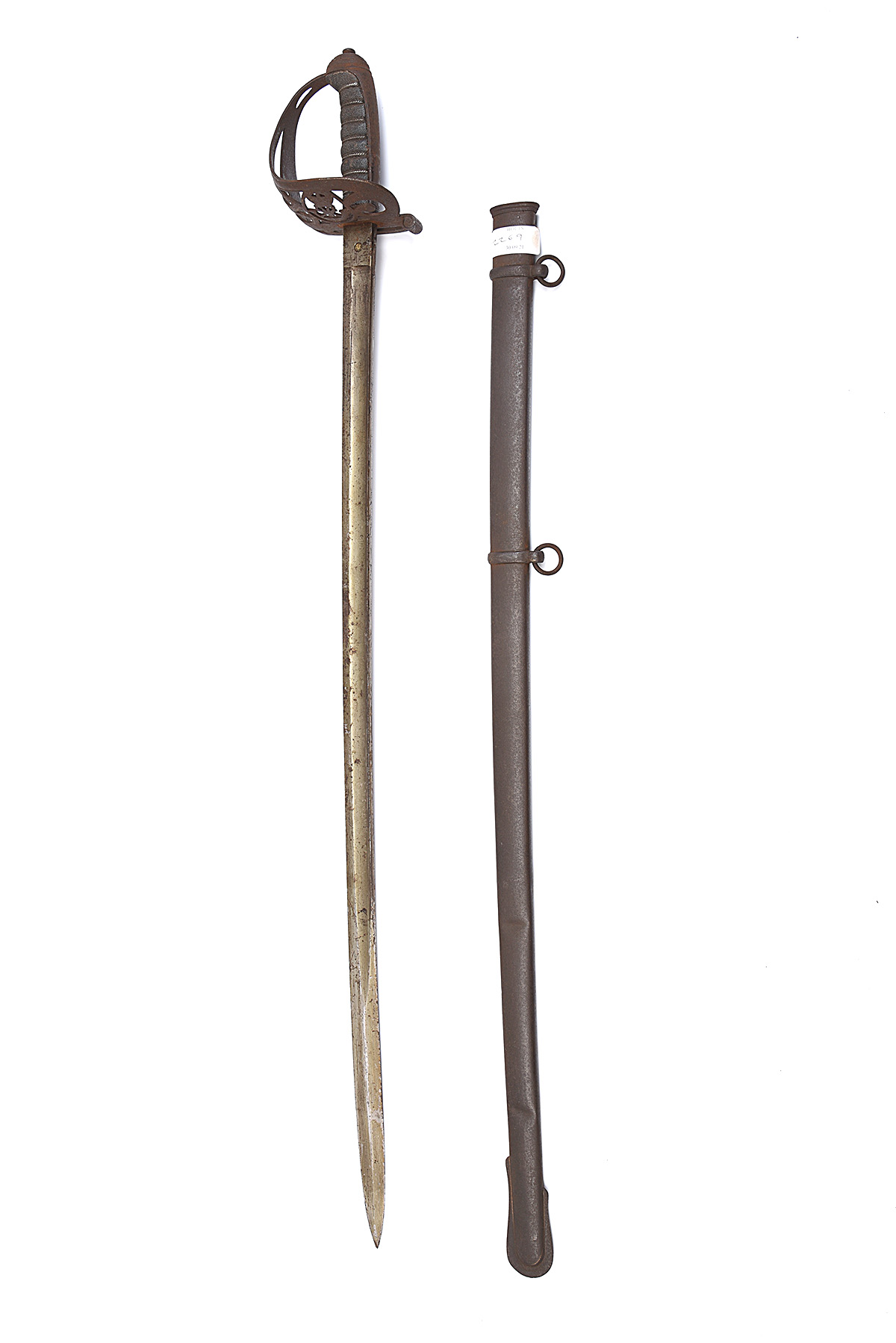 A RIFLE BRIGADE SWORD, circa mid 19th Century, with 32 3/4in. plated plate, fullered and etched to each side, brass proved plug in sunburst on one side of ricasso, 'C. SMITH & SON / PICCADILLY / LONDON' to the other Gothic steel hilt with crown and bugle cypher, black fish-skin wire-bound grip, together with its steel scabbard, blade rusted and plating lifting in places, hilt and scabbard heavily rusted, scabbard rusted and dented, 39in. overall