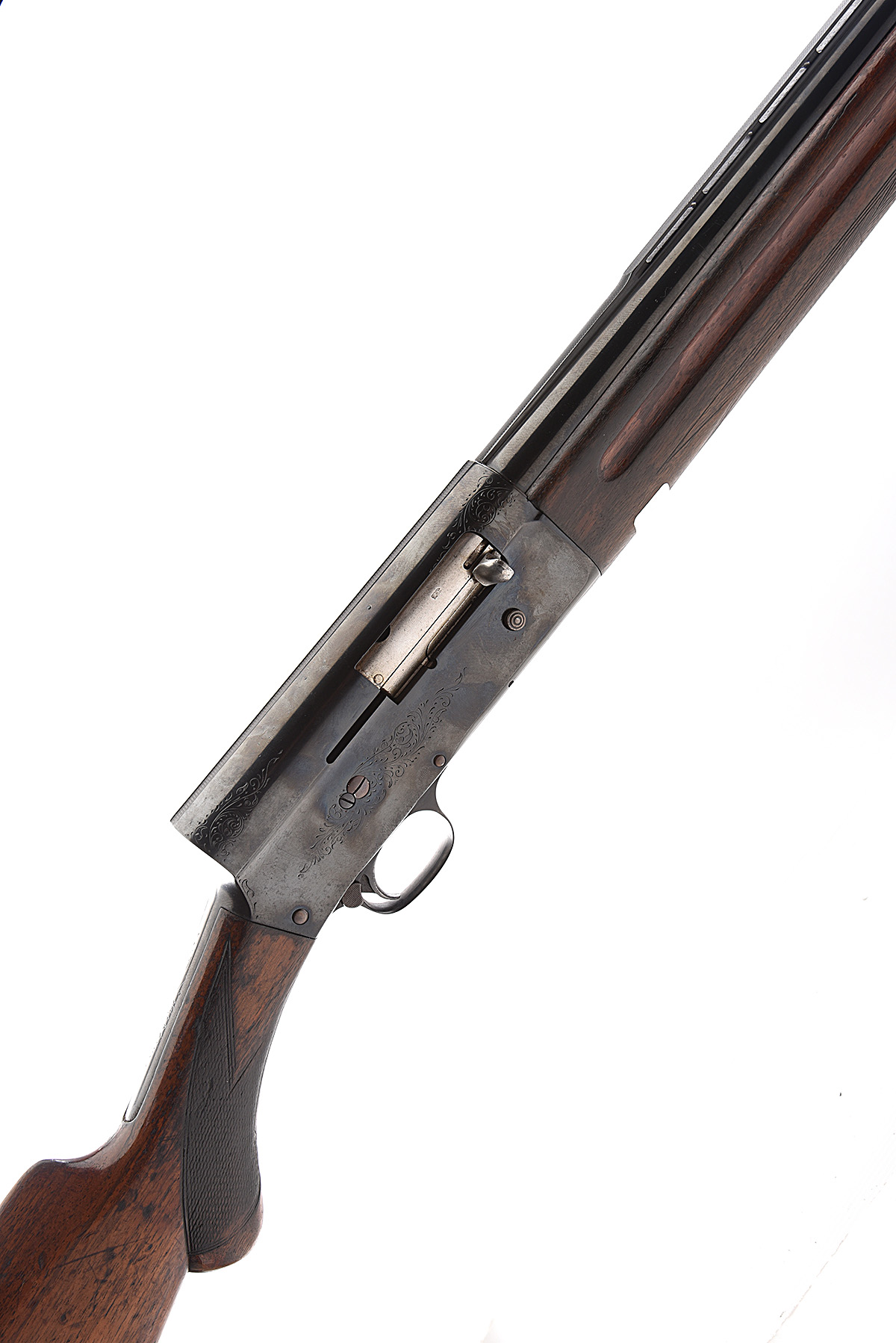 F.N. BROWNING 12-BORE 'AUTO-5' SEMI-AUTO SHOTGUN, serial no. 462476, circa 1957, restricted magazine, 29in. nitro barrel with 7mm raised ventilated matt rib, 2 3/4in. chamber, bored approx. 3/4 choke, manual push-button safety, magazine cut-off switch, zig-zag bordering with partial acanthus scroll engraving, re-blacked finish, 14 1/2in. semi-pistolgrip stock including trademark buttplate, sling swivels, weight 8lb. 10oz.