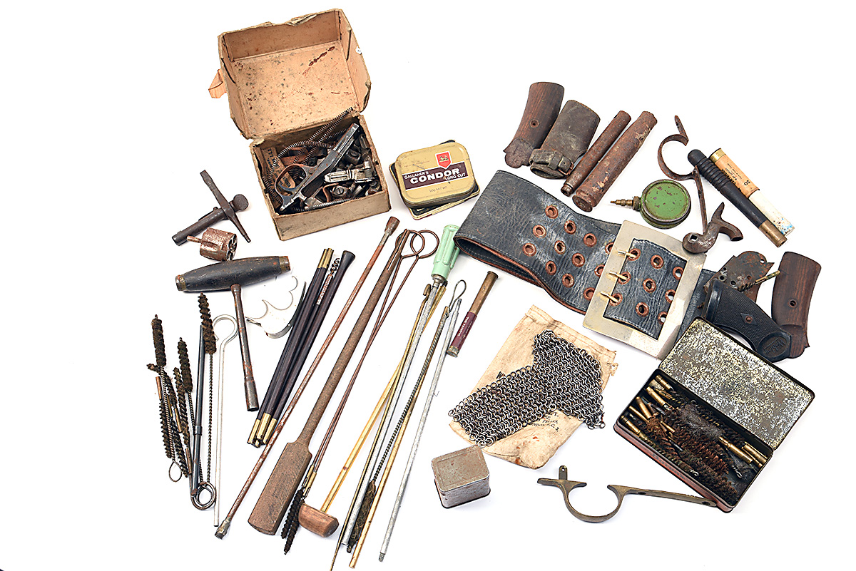 A BOX OF MIXED MILITARIA, VINTAGE ACCESSORIES AND SPARE PARTS, very mixed group of gun parts, cleaning accessories and militaria, including bore-brushes, cleaning rods, trigger-guards, hammers, barrel band and swivel, pistol grips, etc., etc., noted a tool for the M1853 Enfield rifle, a 12-bore ring cartridge extractor, a folding brass and ebony ball-extractor, a chain-mail epaulette