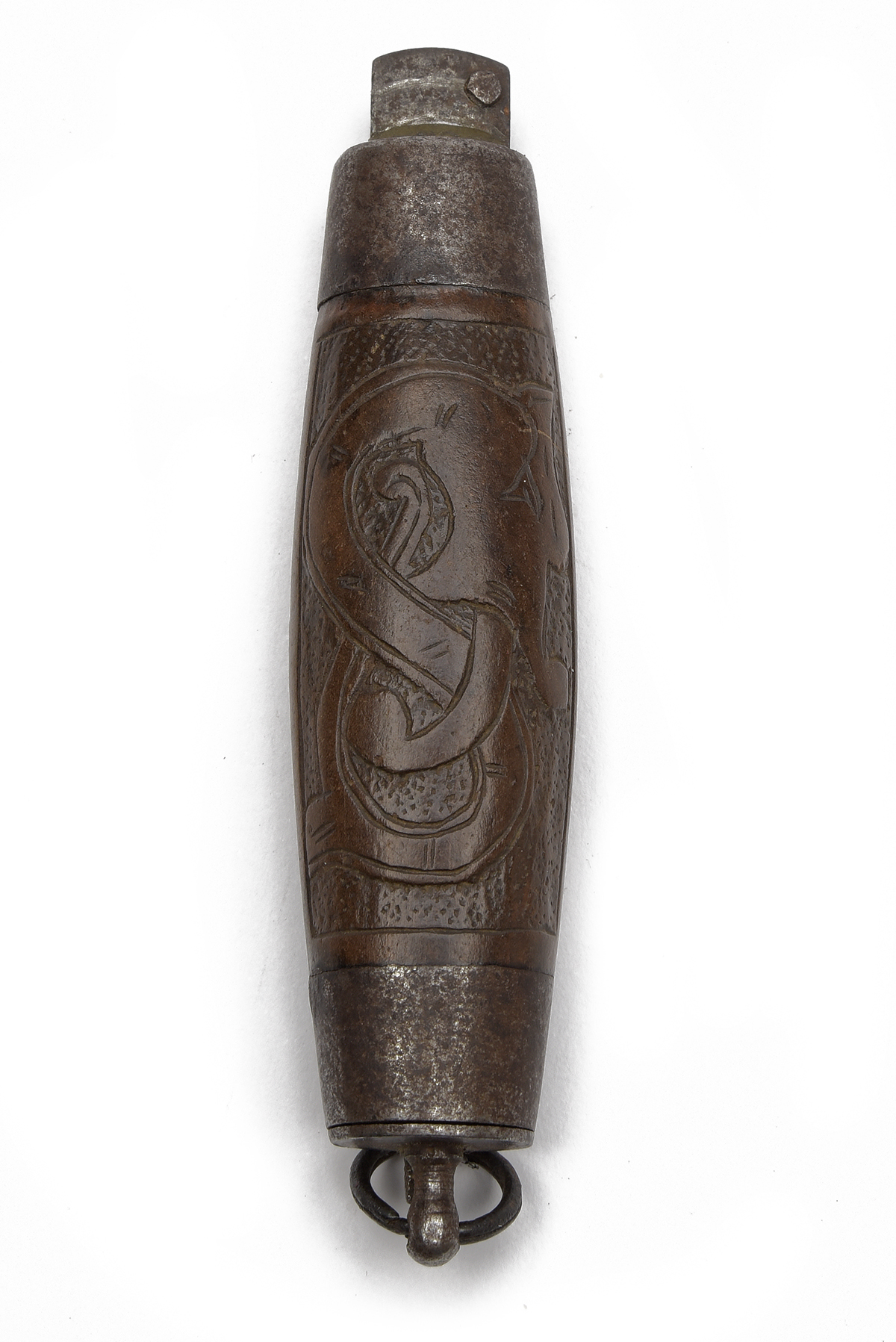 A SWEDISH METAMORPHIC BARREL-KNIFE SIGNED 'A.J WESTERSSEN', early 20th century with clip-point 2 1/2in. blade (stained), brass action, iron bolsters and wood barrel-shaped body with good amateur nordic carving, approximately 6in. deployed, lanyard ring to one end