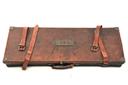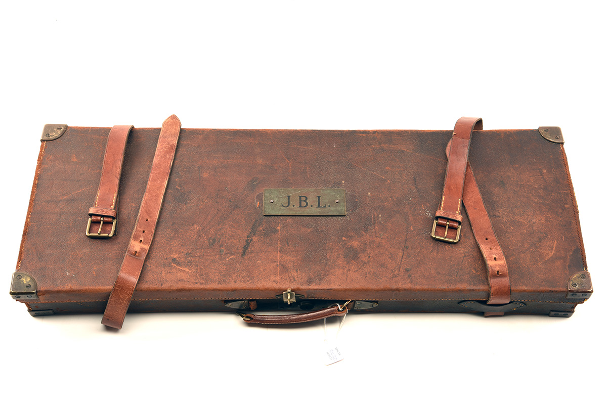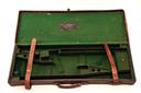 A BRASS-CORNERED LEATHER DOUBLE GUNCASE, fitted for 28in. barrels (could adapt to 30in.), the interior lined with green baize, a W.C. Carswell trade label, brass lock (key missing), replacement handle (not attached)