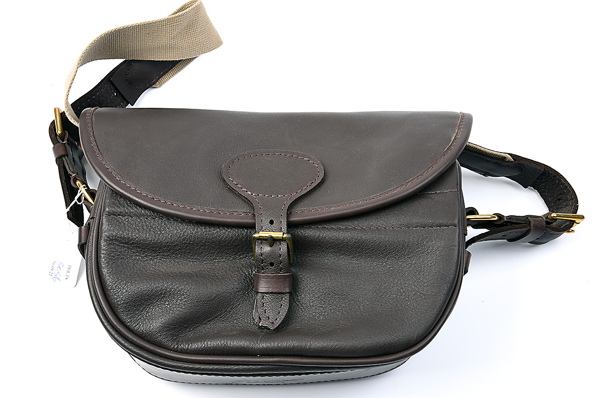 † A NEW AND UNUSED JO YORATH LEATHER LARGE CARTRIDGE BAG, for approx. 150 cartridges, with canvas and leather shoulder strap and brass fittings