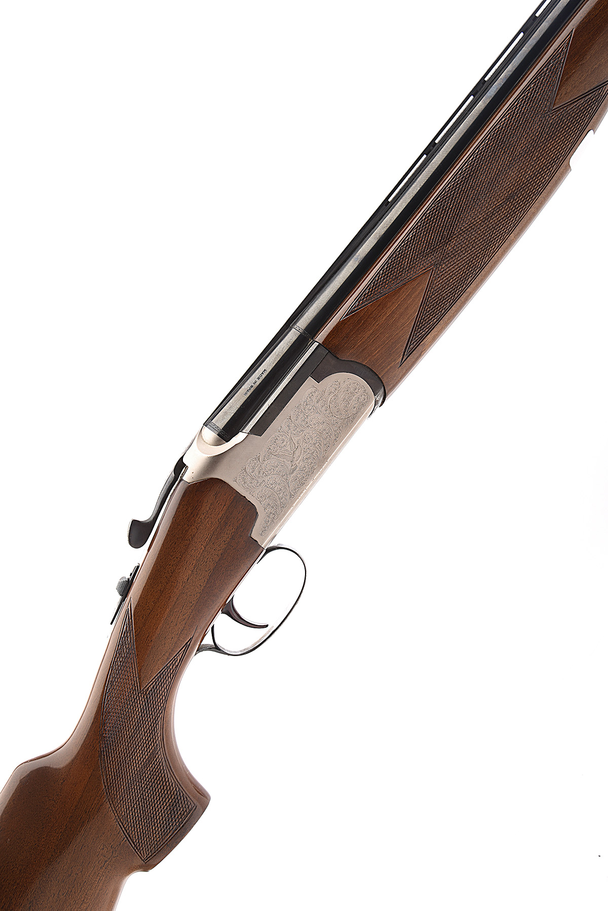 LANBER 12-BORE SINGLE-TRIGGER OVER AND UNDER NON-EJECTOR, serial no. 221228, for 1983, 27 1/2in. nitro barrels with 6mm ventilated matt rib, 2 3/4in. chambers, bored approx. 1/4 and 1/2 choke, hold-open toplever at fault, automatic safety with integral barrel-selector switch, scroll engraving with pheasant in flight, bright finish, 14in. pistolgrip stock including trademark buttplate
